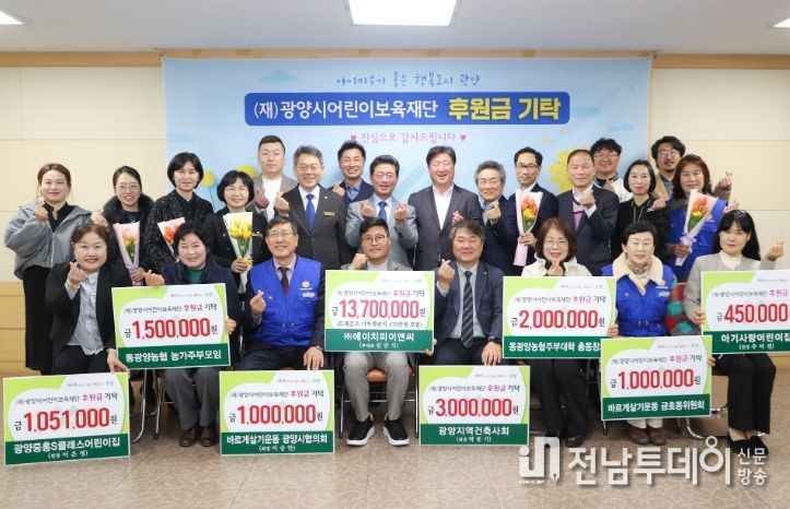 광양시 관계자는 “많은 분들이 어린이보육재단에 따뜻한 관심과 사랑을 보내주셔서 감사하다”며 “여러분의 정성이 내실 있는 보육 사업으로 이어져 아이 키우기 좋은 도시 광양을 만드는 데 큰 힘이 될 것”이라고 전했다.