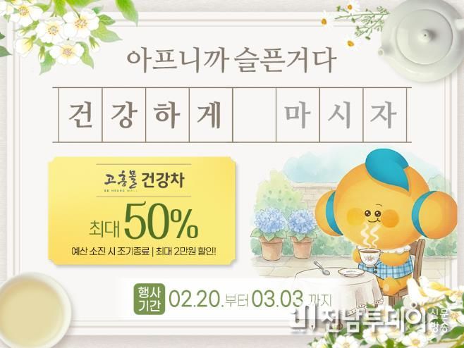 전남투데이 조평훈 기자 | 고흥군이 운영하는 온라인 농수축특산물 쇼핑몰 ‘고흥몰’은 환절기 건강 관리를 돕기 위한 ‘건강차 기획전’을 오는 2월 20일부터 3월 3일까지 진행한다고 밝혔다.