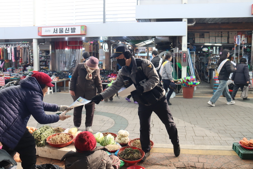 전남투데이 강길수 기자 | 구례경찰서(서장 정덕교)는 지난 13일 구례 5일시장을 방문하여 금융범죄 취약계층 어르신 대상 보이스피싱 예방 홍보활동을 전개했다. 어르신 맞춤 큰 글씨로 제작한 보이스피싱 예방 홍보물을 제작하여 5일시장 방문객 및 시장상인들에게 보이스피싱 대처방법에 대해 홍보하였다.