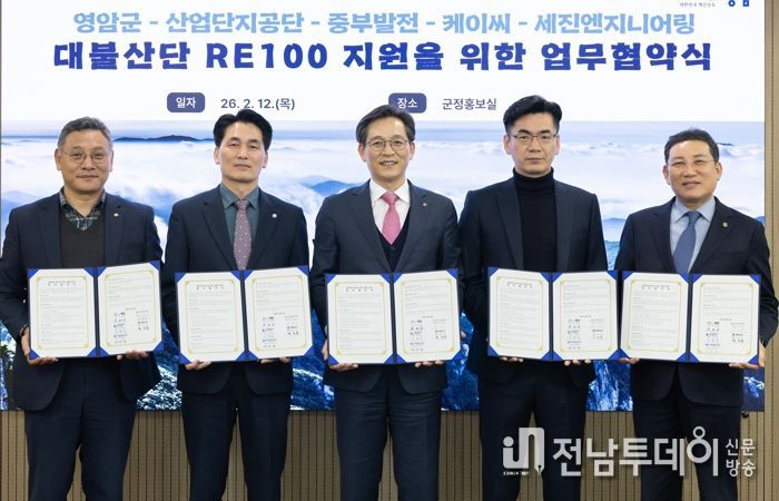영암군이 12일 군청에서 한국산업단지공단, 한국중부발전(주), 케이씨(주), ㈜세진엔지니어링과 ‘대불산단 RE100 지원 업무협약’을 맺었다.