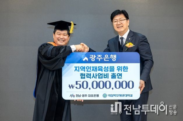 전남투데이 김경민 기자 | 광주은행(은행장 정일선)은 20일, 국립목포해양대학교 컨벤션홀에서 김종민 광주은행 부행장과 최부홍 국립목포해양대학교 총장을 비롯한 양 기관 관계자들이 참석한 가운데, 지역 인재 육성을 위한 협력사업비 5천만 원을 출연했다고 밝혔다.