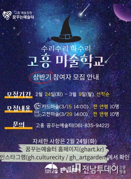 전남투데이 조평훈 기자 | 고흥군은 마술을 매개로 창의력과 집중력, 자신감을 기를 수 있는 체험형 문화예술교육 프로그램인 ‘수리수리 마수리 '고흥 마술학교'’의 상반기 참여자를 모집한다.