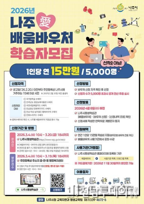 나주시는 19세 이상 시민을 대상으로 연간 15만 원을 바우처 전용 카드로 지원하는 ‘나주애배움바우처’ 학습자 신청을 3월 4일부터 20일까지 접수한다고 23일 밝혔다.