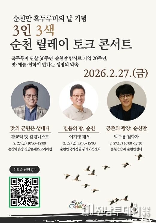 전남투데이 조평훈 기자 | 순천시는 2월 27일부터 3월 2일까지 ‘2026 순천만 흑두루미의 날’을 맞아 '3인 3색 순천 릴레이 토크 콘서트'와 '순천만 치유·탐조 프로그램'을 운영한다고 밝혔다.
