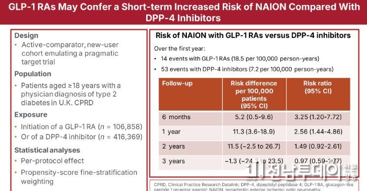 그 결과, 치료 시작 후 1년 이내 NAION 발생 위험은 GLP-1 치료제 사용군에서 비교군 대비 약 2.6배 높았다(위험비 2.56, 95% 신뢰구간 1.44-4.86).