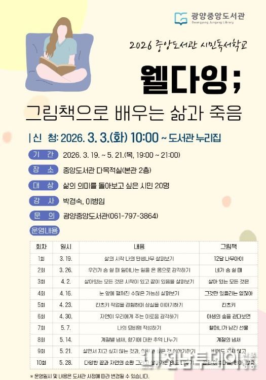 광양시 관계자는 “시민독서학교는 철학과 웰다잉 등 삶과 맞닿은 인문학 주제를 통해 시민들이 책을 깊이 있게 읽고 사유할 수 있도록 돕는 프로그램”이라며 “책을 사랑하는 시민들의 많은 관심과 참여를 바란다”고 전했다.