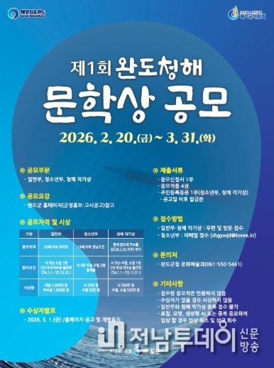 전남투데이 김용희 기자 | ‘치유의 섬’ 완도군에서는 많은 사람들이 문학의 향기로 마음을 치유할 수 있도록 ‘제1회 완도 청해 문학상’ 공모전을 연다.