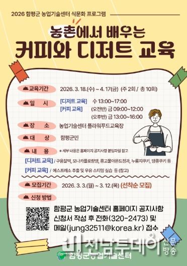 함평군 농업기술센터는 “내달 3일부터 12일까지 ‘농촌에서 배우는 커피와 디저트 교육’ 수강생을 모집한다”고 27일 밝혔다.