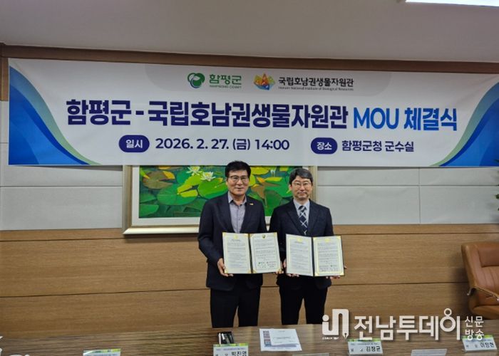 전남투데이 김용희 기자 | 국립호남권생물자원관과 함평군은 2월 27일, 섬·연안 생물자원의 보전 가치 확산과 전시·교육 활성화를 위해 업무협약(MOU)을 체결했다.