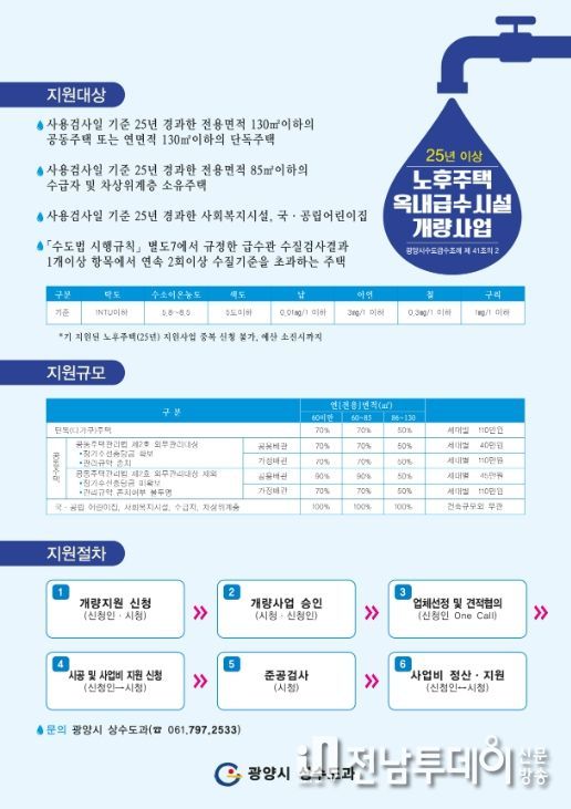 전남투데이 조평훈 기자 | 광양시는 옥내급수시설의 노후로 수도꼭지 녹물 발생 등 불편을 겪는 시민의 생활환경을 개선하기 위해 2019년부터 추진해 온 ‘노후 주택 옥내급수시설 개량사업’을 2026년 3월부터 시행한다고 밝혔다.