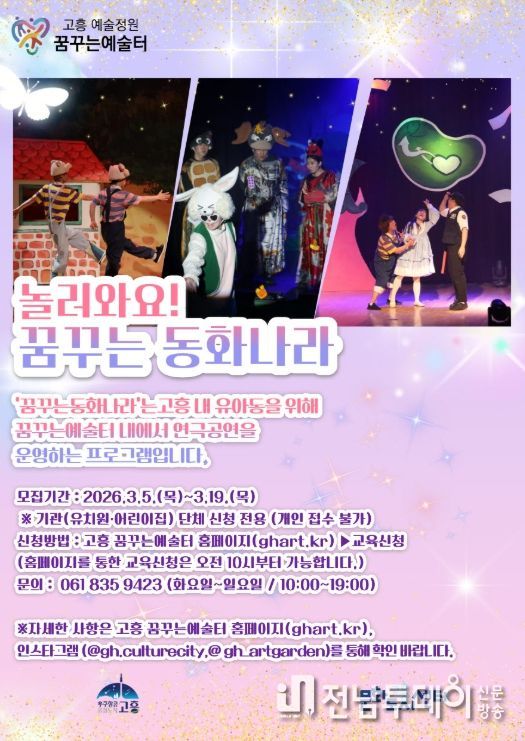 전남투데이 조평훈 기자 | 고흥군은 오는 3월 5일부터 19일까지 어린이 연극 ‘놀러와요 '꿈꾸는 동화나라'’공연을 관람할 관내 유치원과 어린이집 등 단체를 모집한다고 밝혔다.
