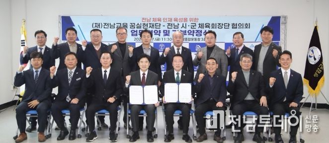 전남투데이 김용희 기자 | (재)전남교육 꿈실현재단과 전라남도 시·군 체육회장단 협의회(회장 이상대)가 지난 2월 27일 영암종합운동장 회의실에서 전남 체육 인재 육성을 위한 업무협약을 체결했다.