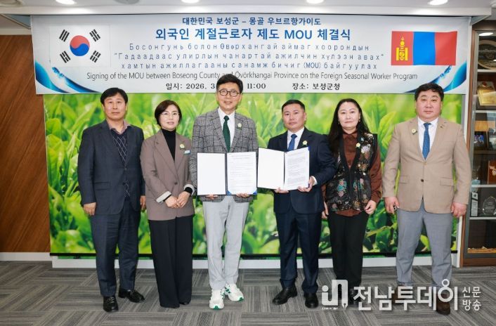 전남투데이 조평훈 기자 | 보성군은 4일 군청에서 몽골 우브르항가이도와 외국인 계절근로자 제도의 안정적인 운영을 위한 업무협약(MOU)을 체결했다고 밝혔다.