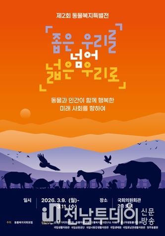 전남투데이 김용희 기자 | 기후에너지환경부 산하 국립호남권생물자원관은 국내 동물이 겪는 실태를 알리고 선진 동물복지 사회로의 발전 필요성을 공유하고자 여러 기관과 협력해 동물복지특별전 ‘좁은 우리를 넘어 넓은 우리로’를 3월 9일부터 11일까지 국회의원회관 2층 로비에서 개최한다.