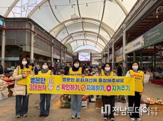 특히 설 연휴를 앞둔 2월 11일 광양읍 5일시장 일원에서 보건소 직원 5명이 참여해 병문안 문화개선 캠페인을 펼치며, 시민들에게 병문안 문화 개선 3대 원칙인 ▲확인하기(병문안 가능 시간과 장소 확인) ▲자제하기(환자를 위해 병실 면회 자제) ▲지켜주기(손 위생, 기침 예절 등 예방수칙 준수)의 실천을 안내했다.