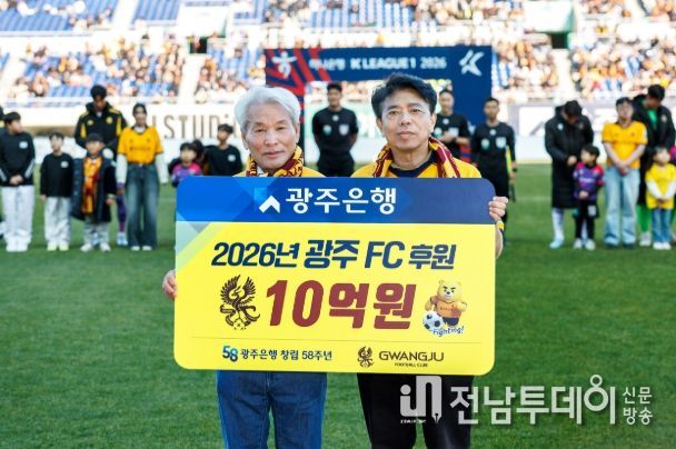 전남투데이 김경민 기자 | 광주은행은 지난 7일 광주월드컵경기장에서 열린 광주FC 홈 개막전에서 광주FC의 2026 시즌 선전을 기원하며 후원금 10억 원을 전달했다고 밝혔다.