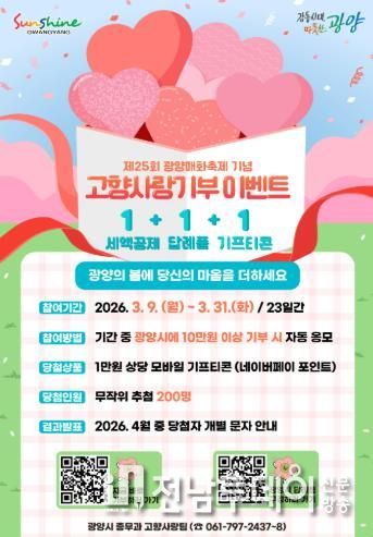 전남투데이 조평훈 기자 | 광양시는 대한민국 대표 봄 축제인 ‘제25회 광양매화축제’를 기념해 고향사랑기부제에 대한 관심과 참여를 높이기 위해 3월 9일부터 3월 31일까지 고향사랑기부 이벤트를 실시한다고 밝혔다.