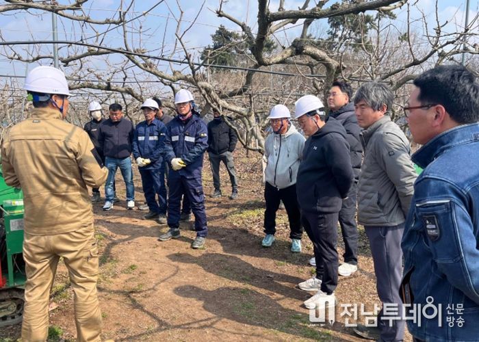 전남투데이 박세훈 기자 | 영광군은 9일 군서면 만곡리의 감 재배 농가에서 2026년 영농부산물 파쇄지원단 발대식 및 안전교육을 진행했다.