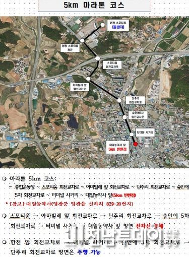 국도 22호선의 법성·홍농방면 신평교차로부터 전면통제에 따른 10km, Half 코스 우회구간은 신평교차로 – 만곡사거리 – 논산보건진료소 – 장산리 회전교차로 – 원불교 영산성지 – 국민여가캠핑장 – 법성포 방면으로 안내할 계획이다.