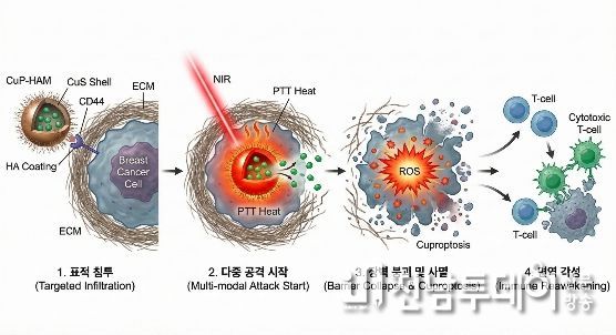전남투데이 김용희 기자 | 전남대학교 의과대학 박인규 교수 연구팀이 난치성 암으로 꼽히는 '삼중음성 유방암(TNBC)'을 획기적으로 치료할 수 있는 다기능성 혁신 나노 전달체(CuP-HAM)를 개발하는 데 성공했다.