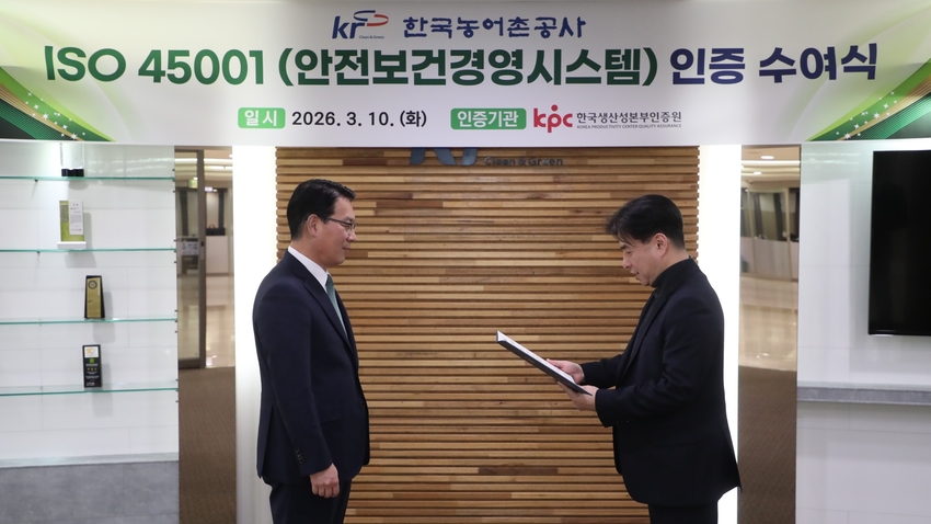 한국농어촌공사(사장 김인중)는 안전보건 관리 강화를 위한 전사적 노력을 인정받아 ‘국제표준 안전보건경영시스템(ISO 45001)’ 인증을 취득했다고 11일 밝혔다.