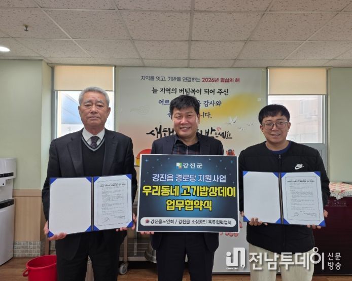 전남투데이 박동운 기자 | 강진읍 노인회가 지난 4일, 2026년 ‘우리동네 고기밥상데이’ 사업의 원활한 추진을 위해 강진읍 소상공인 육류협력업체와 업무협약을 체결했다.