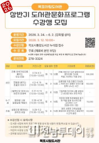 수강 신청은 3월 12일부터 목포시통합도서관 누리집을 통해 선착순으로 접수하며, 목포 및 인근 지역 주민이면 누구나 참여할 수 있다.