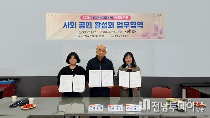 전남투데이 조평훈 기자 | 광양노인복지관은 지난 10일 복지관에서 지역사회 공헌 활동을 확대하고 민·관 협력체계를 구축하기 위해 광양시자원봉사센터, 서산나래와 업무협약을 체결했다.