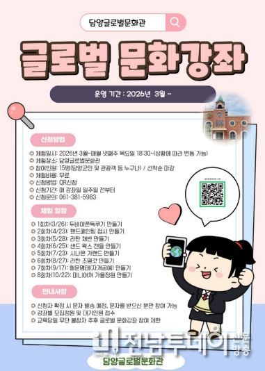 전남투데이 허은석 기자 | 담양군이 지난해에 이어 올해도 3월부터 12월까지 매월 마지막 주 목요일에 담양글로벌문화관에서 ‘글로벌 문화강좌’를 운영한다.