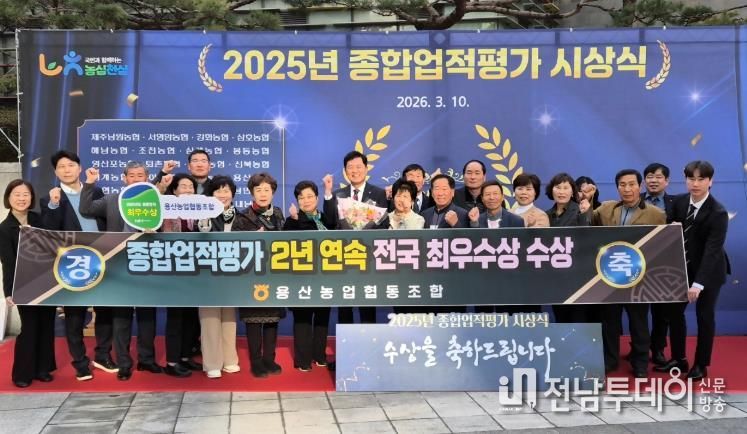 전남투데이 김용희 기자 | 용산농협은 지난 3월10일 농협중앙회 본부 대강당에서 열린 ‘2025년 종합업적평가 최우수 농·축협 시상식’에서 종합업적평가 최우수상 수상과 클린뱅크 금 등급을 수상하는 영예를 안았다.