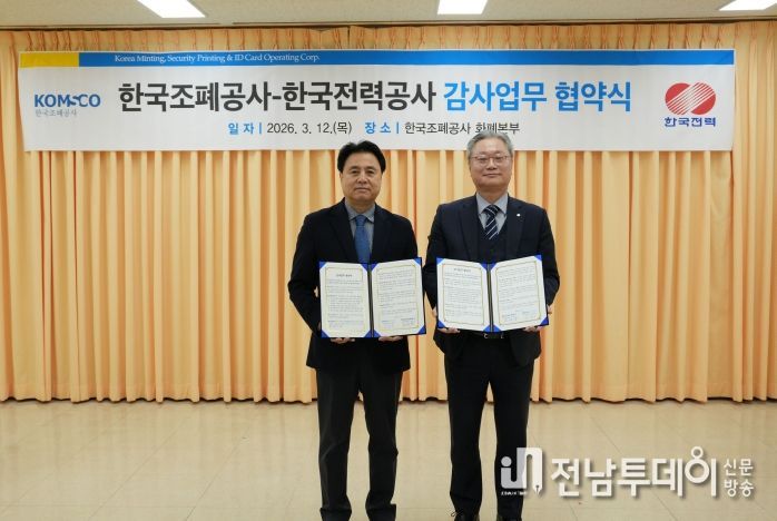 전남투데이 김용희 기자 | 한국전력 감사실이 3월 12일 한국조폐공사 감사실(상임감사 김범진)과 감사 전문성 제고와 내부통제 강화를 위한 업무협약(MOU)을 체결했다.