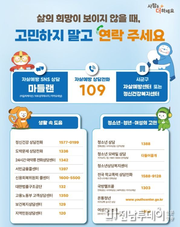 또한 도민이 쉽게 도움을 받도록 자살예방 상담전화 ‘109’와 정신건강 상담전화 등 위기 상담 서비스를 적극 안내하고, 시군 정신건강복지센터와 연계해 고위험군 상담과 사례관리를 강화한다.