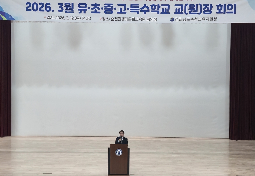 전남투데이 조평훈 기자 | 전라남도순천교육지원청(교육장 김신규)은 3월 12일 순천만생태문화교육원 공연장에서 관내 유․초․중․고․특수학교 교(원)장 82명을 대상으로 2026학년도 3월 교(원)장 회의를 개최했다.