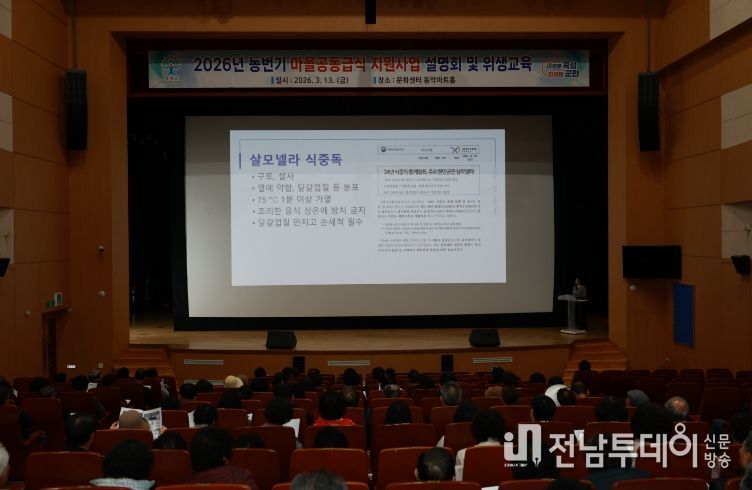 전남투데이 정홍균 기자 | 전남 곡성군은 13일 곡성문화센터 동악아트홀에서 농번기 마을 공동급식을 추진하는 136개 마을을 대상으로 마을대표, 조리원, 반찬배달업체 등 200여 명이 참석한 가운데 2026년도 농번기 마을공동급식 지원사업 추진 지침 설명회 및 위생교육을 실시했다고 밝혔다.