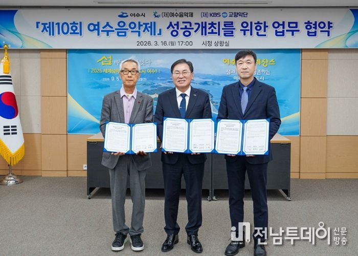 전남투데이 조평훈 기자 | 여수시는 16일 시청 상황실에서 (재)여수음악제, (재)KBS교향악단과 ‘제10회 여수음악제’의 성공적인 개최를 위한 업무협약(MOU)을 체결했다고 밝혔다.