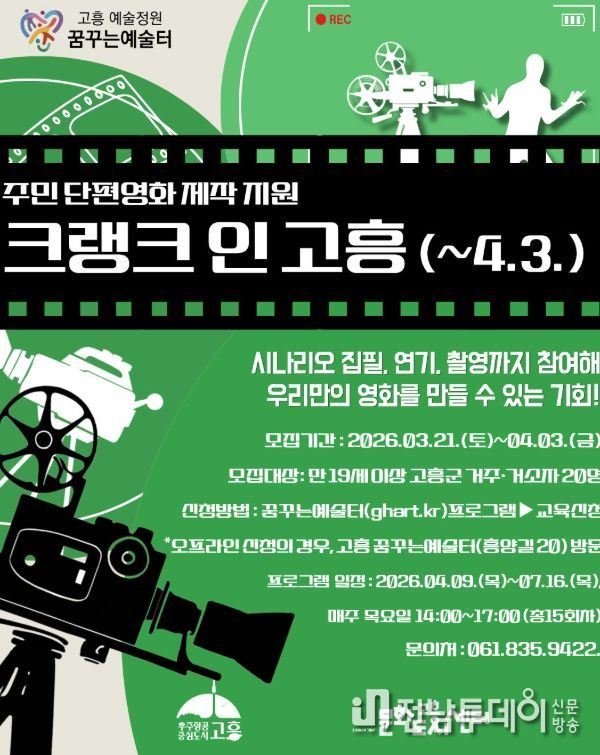 전남투데이 조평훈 기자 | 고흥군이 주민이 직접 시나리오 작성부터 연출, 연기, 촬영까지 전 과정에 참여해 한 편의 영화를 완성하는 주민 단편영화 제작 지원 프로그램 ‘크랭크 인 고흥’ 2기 참여자를 모집한다.