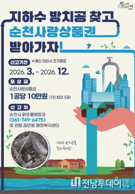 신고 대상은 장기간 미사용 상태로 방치된 지하수 관정으로, 방치공 위치와 현장 사진 등 확인 가능한 자료를 첨부해 순천시 맑은물행정과 또는 관할 읍면동 행정복지센터(온라인·전화·방문 등)를 통해 신고하면 된다.