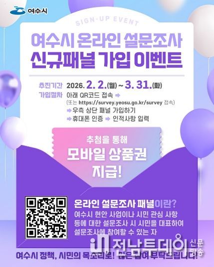 전남투데이 조평훈 기자 | 여수시가 오는 3월 31일까지 ‘온라인 설문조사 신규 패널 가입 이벤트’를 실시한다고 밝혔다.