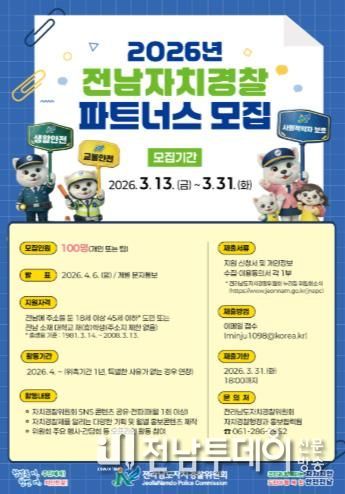 전남투데이 김용희 기자 | 전라남도자치경찰위원회는 도민과의 소통을 강화하고 현장 중심 자치경찰 치안 활동을 함께할 ‘2026년 전남자치경찰 파트너스’를 31일까지 모집한다고 밝혔다.