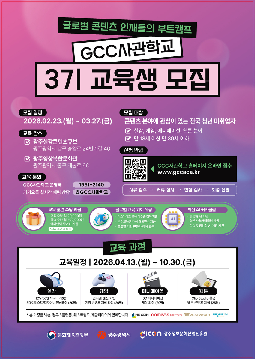 교육은 GCC(광주실감콘텐츠큐브)와 광주영상복합문화관의 전문 교육장비를 이용하며, 전 과정 무료로 운영된다. 모집 대상은 만 18세~39세 이하 콘텐츠 분야에 관심 있는 전국 청년 미취업자 100명 내외다. 3월 27일까지 GCC사관학교 공식 누리집(https://gccaca.kr)을 통해 신청할 수 있다. 서류심사와 면접 심사 등 단계별 절차를 거쳐 4월 3일 최종 합격자를 발표할 예정이다.
