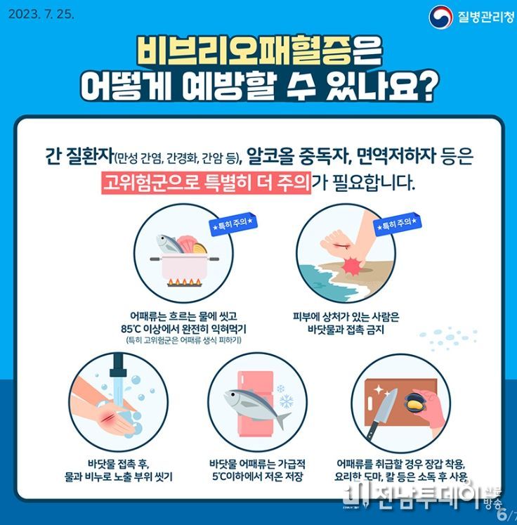 보건소 관계자는 비브리오 패혈증 예방을 위해 ▲어패류 충분히 익혀 섭취 ▲피부 상처가 있을 경우 오염된 바닷물 접촉 자제 ▲바닷물 접촉 후 깨끗한 물과 비누로 노출 부위 세척 ▲어패류 취급 시 장갑 착용 및 칼·도마 소독 후 사용 등 예방수칙 준수의 중요성을 강조했다.