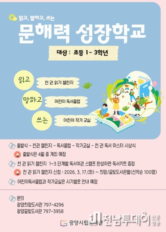 전남투데이 조평훈 기자 | 광양시는 어린이들의 기초학습 역량인 문해력을 높이기 위해 4월부터 광양희망도서관과 광양꿈빛도서관에서 ‘문해력 성장학교’를 운영한다.