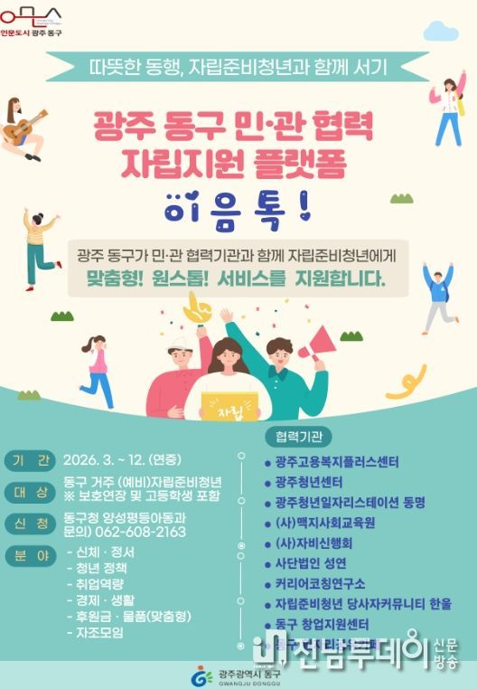 전남투데이 김경민 기자 | 광주 동구는 보호 종료 5년 이내 자립 준비 청년을 대상으로 민·관 협력 자립지원 플랫폼 ‘이음톡!’ 사업을 지난해에 이어 2026년에도 지속 추진한다고 밝혔다.