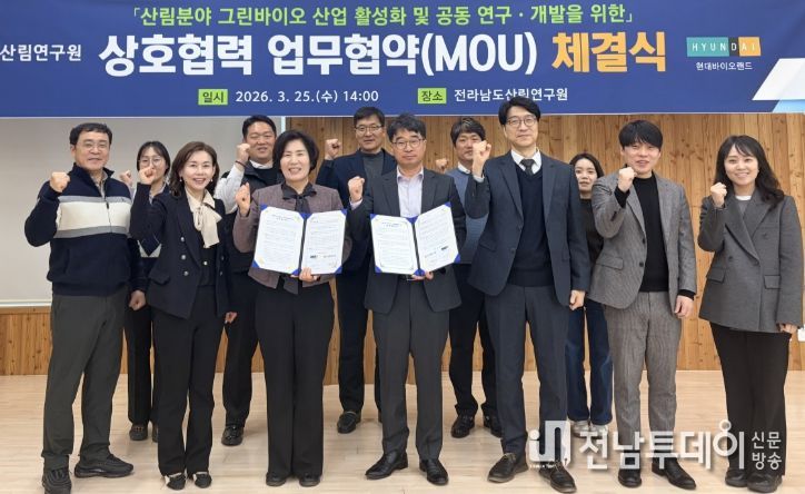 전남투데이 김용희 기자 | 전라남도산림연구원이 25일 ㈜현대바이오랜드와 산림자원을 활용한 그린바이오 산업 활성화를 위해 업무협약을 하고, 고부가가치 제품 개발과 원물의 안정적 생산체계 구축을 위한 상호 협력에 나섰다.