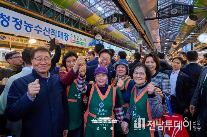 전남투데이 정홍균 기자 | 이재명 대통령은 30일 오후 제주 타운홀미팅 '제주의 마음을 듣다' 종료 후, 김혜경 여사와 함께 1박 2일 제주 일정의 마지막 일정으로 동문시장을 방문했다.