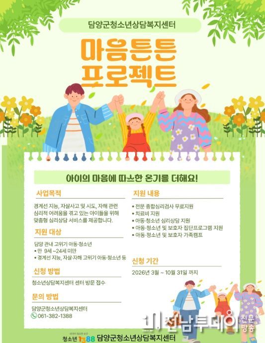 전남투데이 허은석 기자 | 담양군청소년상담복지센터(센터장 손은아)는 정서적 위기를 겪는 지역 내 아동·청소년의 심리 회복과 건강한 성장을 돕고자 오는 10월까지 ‘마음튼튼 프로젝트’을 추진한다.