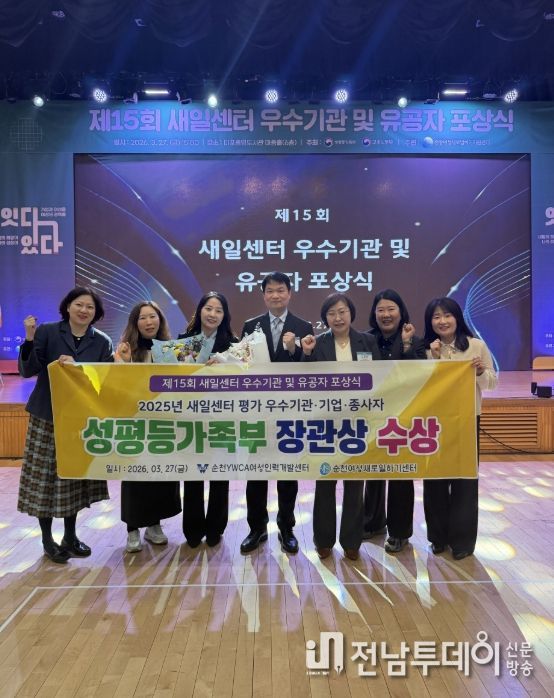 전남투데이 조평훈 기자 | 순천시는 지난 27일 서울 마포구에서 열린 ‘제15회 새일센터 우수기관 및 유공자 포상식’에서 순천YWCA여성인력개발센터의 여성새로일하기센터가 2025년 전국 새일센터 평가에서 상위 10%인 A등급 우수기관으로 선정되며, ‘성평등가족부 장관상’을 수상했다고 밝혔다.