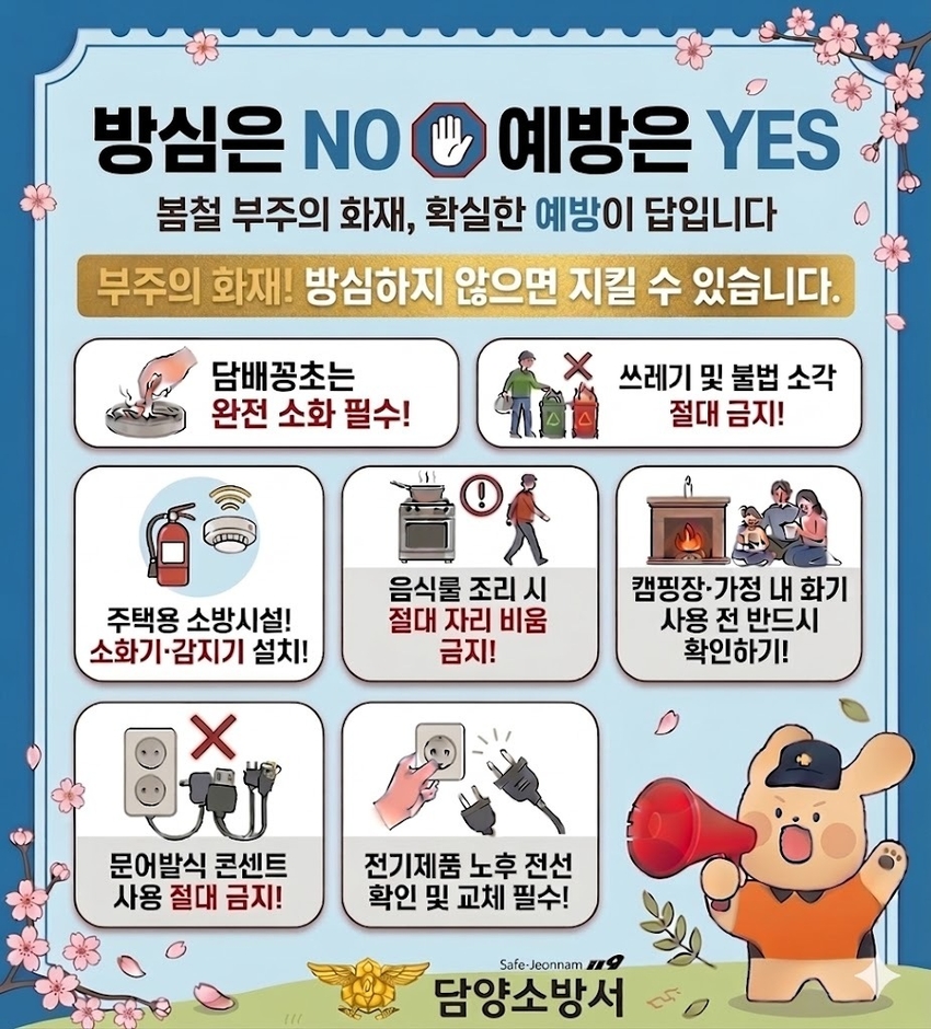 이중희 담양소방서장은 “봄철 화재는 한순간의 방심으로 소중한 생명과 재산을 앗아갈 수 있다”며 “일상 속 작은 예방수칙 준수만으로도 충분히 막을 수 있는 만큼, 지역민들의 적극적인 동참을 부탁드린다”고 전했다.