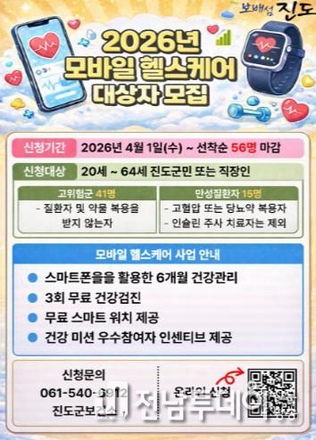 전남투데이 문경식 기자 | 진도군보건소는 4월 1일부터 ‘2026년 모바일 헬스케어 2기’ 대상자 56명을 선착순으로 모집하고 있다.