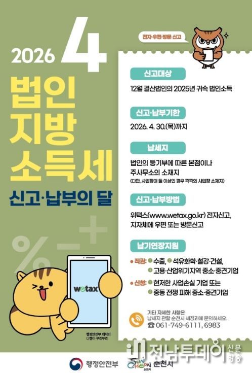 전남투데이 조평훈 기자 | 순천시는 4월 한 달을 법인지방소득세 집중 신고·납부 기간으로 운영하며, 관내 법인들은 4월 30일까지 신고·납부를 완료해 줄 것을 당부했다.